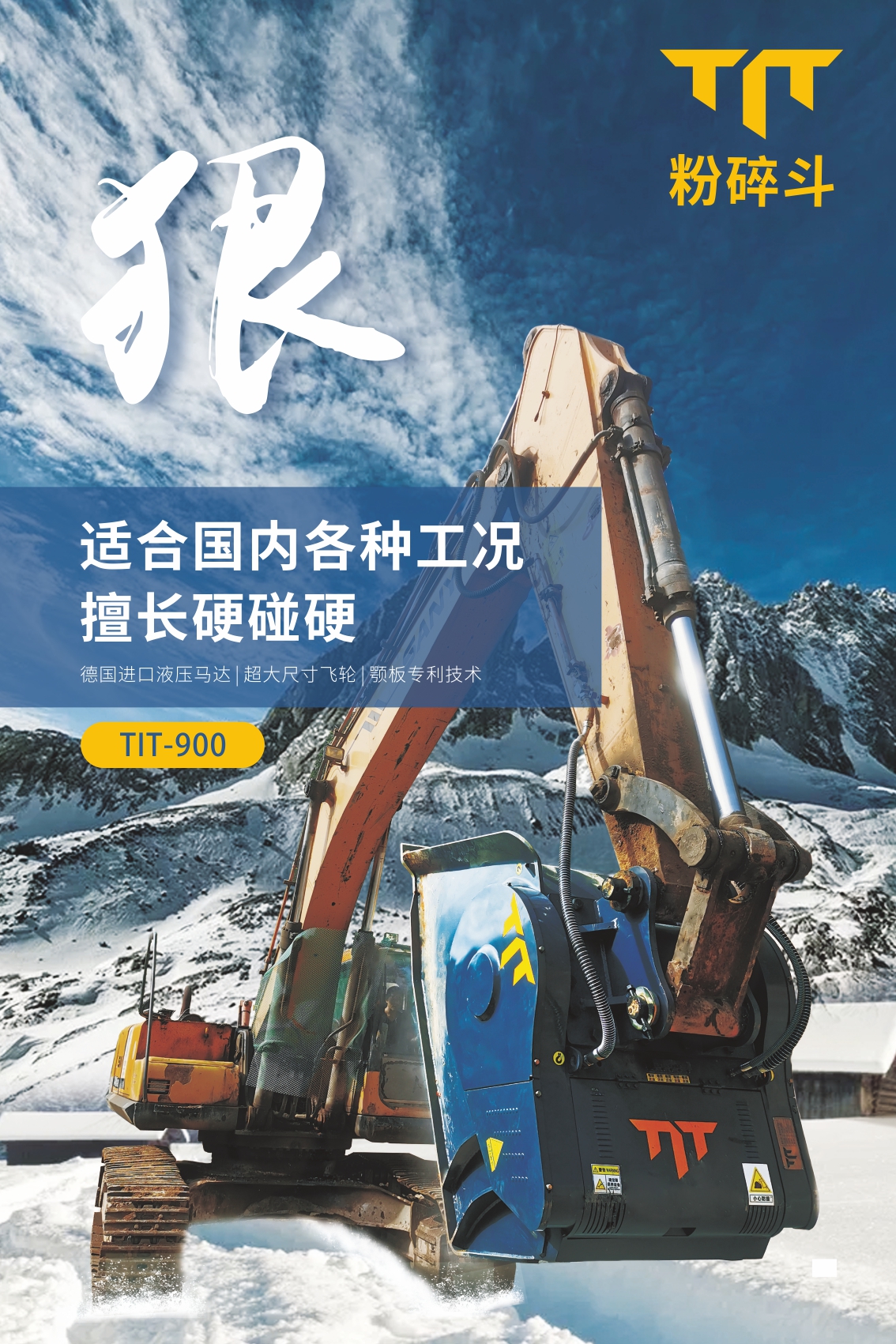TIT,源自Titan的縮寫,原指古希臘神話中力大無窮的威猛之神,借意本產(chǎn)品剛勁有力,產(chǎn)能高效。TIT粉碎斗,也稱破碎斗,顎式破碎斗,是一款創(chuàng)新型挖掘機屬具,掛于挖掘機大臂上,可快速將工程惰性材料破碎成極具價值的工程用料。隨著國內基建行業(yè)展,基于市場對經(jīng)濟化、效率化、環(huán)保化材料的大量需求,破碎斗將廣泛應用于多種物料破碎場景。 |
